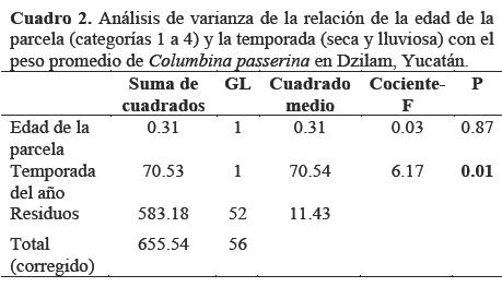 C.passerina usando una ANDEVA factorial. El peso promedio fue de 39 g. La estacionalidad tuvo un efecto en la diferencia de pesos, pero la edad de abandono no. En las parcelas con menos años de abandono capturamos el 96% de los individuos, lo que quizá se deba a que la abundancia de especies de plantas con semillas pequeñas se presente en las primeras etapas sucesionales. Los mayores pesos se encontraron en la época de lluvias, cuando casi todas las especies de plantas producen semillas, ya que éste es un ecosistema estacional. En ecorregiones altamente productivas de Centroamérica se encontraron pesos de entre 30 y 35 g para la especie, lo que sugiere que los ecosistemas más productivos no necesariamente tienen más recursos para esta especie.