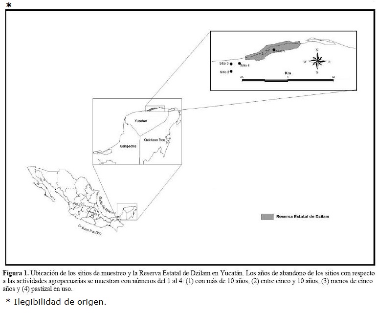 El área de estudio se encuentra en terrenos de la Reserva Estatal de Dzilam, al noreste del estado de Yucatán, y en potreros aledaños (Figura 1). El clima es semiseco muy cálido (BS1 según la clasificación de Kôppen-García, en Orellana et al. 2003), con temperaturas anuales promedio de 26ºC y precipitaciones anuales de 650 a 700 mm. Más del 65% de la precipitación cae entre junio y octubre (CNA 2000). La vegetación dominante es la selva baja caducifolia espinosa con diferentes etapas de sucesión secundaria (sensu Flores y Espejel 1995). Este tipo de vegetación es típica del norte de Yucatán, en dónde se encuentran los climas más secos de la Península. Se caracteriza por el predominio de cactáceas, agaváceas y rubiáceas, y otros elementos espinosos.