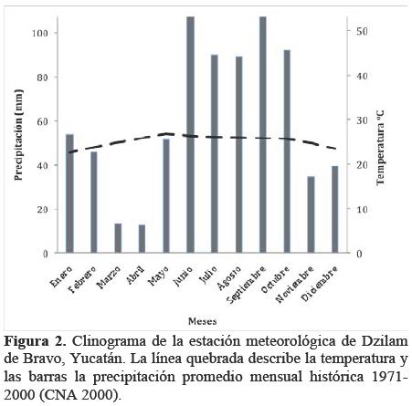 Para los análisis estadísticos consideramos dos temporadas: secas y lluvias. Fueron meses secos aquellos cuya precipitación en milímetros fue menor al doble de la temperatura en grados Celsius (Alcaraz-Ariza 2011). En la Figura 2 mostramos un diagrama climático de la estación más cercana a la Reserva Estatal de Dzilam. Los datos para 30 años los obtuvimos del portal electrónico del Servicio Meteorológico Nacional (CNA 2000). Los meses de noviembre a mayo los consideramos secos; incluimos enero en la estación seca porque está entre dos meses secos y la precipitación apenas excede al doble de la temperatura. El total de meses secos fue de siete y el de meses lluviosos fue de cinco.