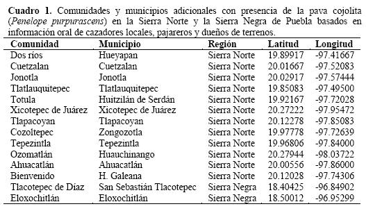Aunque los polígonos propuestos por Howell y Webb (1995) y Ridgely et al. (2007) delimitan la distribución geográfica de la pava cojolita para Puebla y Oaxaca, aquí reportamos localidades adicionales y específicas para la Sierra Norte y Sierra Negra en Puebla, y la Sierra de Juárez, Oaxaca, las cuales complementan el conocimiento sobre la distribución geográfica de esta especie amenazada.