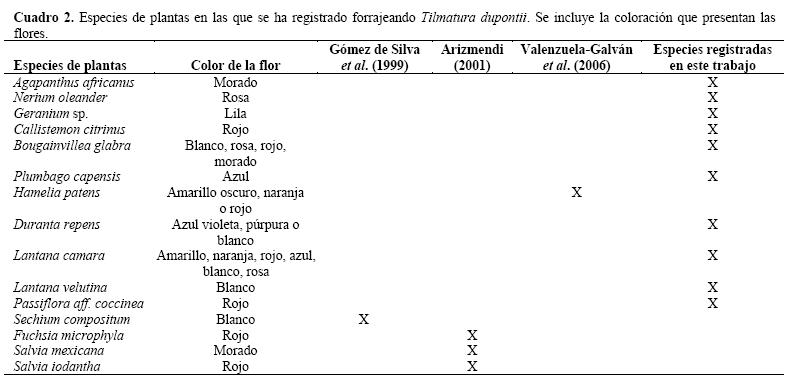 En un estudio llevado a cabo en el Cerro de San Felipe (Lyon 1976), aproximadamente a 31 km de nuestro sitio de estudio, pero a una mayor altitud (25003000 msnm), con condiciones similares de estructura y composición de la vegetación, con un método direccionado a detectar colibríes e interacciones con las plantas de las que se alimentan, se registraron seis especies de colibríes, pero no a T. dupontii. Esto podría ser debido a que ésta y otras especies de colibríes (e.g., Doricha eliza) son difíciles de detectar (Peterson 2004, Díaz-Valenzuela et al. 2011) o que esta especie se mueva en altitudes por debajo de los 2500 msnm; aunque existen reportes por arriba de esa altitud (Rosenberg y Rosenberg 1979, Bindford 1989). Posiblemente, la altitud y la latitud estén regulando su distribución en México, pero la presencia de esta especie en sitios donde su distribución es conocida se relaciona estrechamente con la abundancia de recursos (Rosenberg y Rosenberg 1979, Gómez de Silva et al. 1999, Ortiz-Pulido y Díaz 2001). Quizá, la detección de esta especie en la zona haya sido por este último factor (Forcey 2002), ya que en el área en donde fue observada casi permanentemente existen plantas floreciendo, que en su mayoría son especies exóticas o de ornato (con la excepción de Lantana camara y L. velutina) que han sido introducidas con el fin de mantener flores la mayor parte del año.