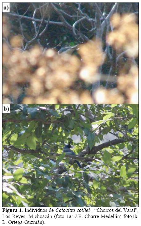 Durante el periodo de 2006 a 2010, obtuvimos cuatro registros que totalizan 11 individuos de la especie. El primer registro ocurrió el 27 de mayo de 2006, a las 10:00 h, observando un individuo mediante puntos de conteo en el bosque tropical subperennifolio del fondo de una barranca; en esa misma sesión también reportamos la ocurrencia de C. formosa como abundante; dos observadores generaron el registro (19°30'54.9"N, 102°34'19.7"O; 885 msnm). El 22 de noviembre de 2008, a las 9:07 h, obtuvimos el segundo registro mediante puntos de conteo en el bosque tropical caducifolio, observando un individuo a 10 m; este registro lo obtuvieron tres observadores (19°30'58.2"N, 102°34'16.1"O; 860 msnm). El día 24 de enero de 2009, a las 11:03 h, tres observadores registraron una parvada mixta de seis individuos de las dos especies de urracas (tres de C. formosa y tres de C. colliei) en el bosque tropical caducifolio, obteniendo un registro fotográfico (19°30'50.4"N, 102°34'19.2"O; 853 msnm; Figura 1a). El registro más reciente ocurrió el 7 de abril de 2010, a las 11:10 h, por dos observadores, registrando un grupo de seis individuos y obteniendo otro registro fotográfico (19°30'54.9"N, 102°34'13.7"O; 986 msnm; Figura 1b). En la evaluación rápida realizada durante el estudio técnico justificativo en 2004, no se generó ningún registro de C. colliei (Huacuz 2005). Para visualizar la distancia de esta nueva localidad de registro a la distribución próxima reconocida, generamos un mapa a partir de un sistema de información geográfica usando como insumos un mapa de la República Mexicana con división política estatal, un mapa de distribución de C. colliei elaborado por Ridgely et al. (2007) y las coordenadas de registro de la especie (Figura 2).