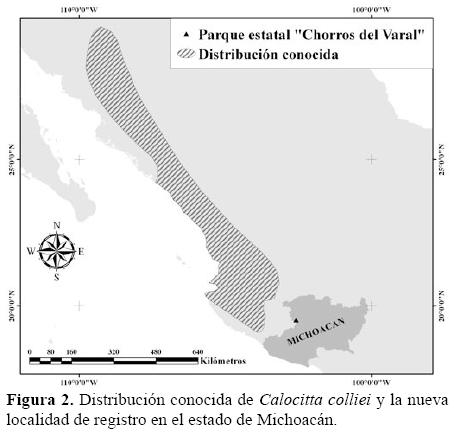 Recientemente, se publicó un nuevo registro de la especie extendiendo su distribución para el extremo sur de la costa de Colima, en el municipio de Tecomán, sugiriéndose una posible continuidad de su distribución más al sur hasta la costa de Michoacán debido a la presencia de parches de vegetación que podrían servir como hábitat para la especie (MacGregor-Fors 2005). Es importante destacar que para la costa michoacana no se tiene registro de la especie ni se le había reportado en ningún inventario local para el resto del estado hasta este estudio (Villaseñor-Gómez 1988, Villaseñor-Gómez y Villaseñor-Gómez 1994, 1997). Por otra parte, en las distribuciones proporcionadas en las guías de campo de aves de México, no se señala al estado de Michoacán como área de distribución de C. colliei (Peterson y Chalif 1973, Howell y Webb 1995, Van Perlo 2006), y tampoco se reporta algún ejemplar colectado ni observado en el estado (GBIF 2000, UNIBIO 2004, CONABIO 2008).