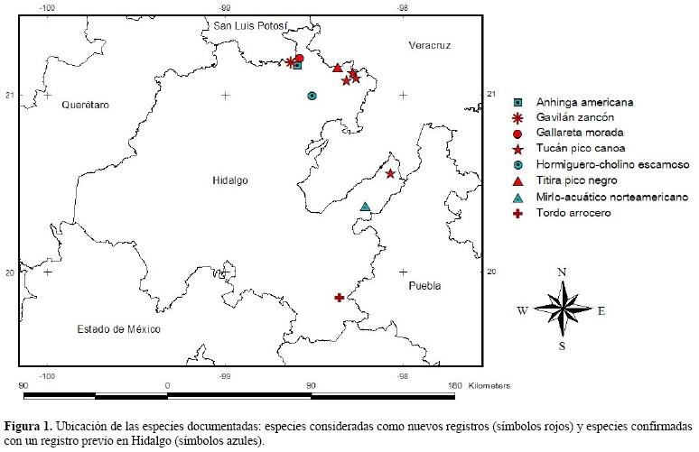 En este estudio reportamos la presencia de G. caerulescens, P. martinica, R. sulfuratus, T. inquisitor y D. oryzivorus. Estas especies no están consideradas como presentes en los listados publicados para Hidalgo (Bjelland y Ray 1977, Mancilla 1988, Howell y Webb 1992, Navarro et al. 1992, Martínez-Morales 2007, Martínez-Morales et al. 2007, Ortiz-Pulido et al. 2010), pero las primeras cuatro sí habían sido contempladas como hipotéticas para el estado (Howell y Webb 1995, Martínez-Morales et al. 2007, Ortiz-Pulido et al. 2010). De las primeras cuatro especies se tienen registros en los estados vecinos de San Luis Potosí (Sánchez-González y García-Trejo 2010) y Veracruz (Howell y Webb 1995). El sitio más cercano a las localidades reportadas en Hidalgo para G. caerulescens, P. martinica y T. inquisitor es el río Axtla, cerca de Xilitla (Davis 1952). Por otra parte, R. sulfuratus fue documentado por Sutton y Burleigh (1940) en el río Axtla cerca de Tamazunchale. Esta misma especie la reportó Davis (1952) en las cercanías de Xilitla. Todas las localidades mencionadas se ubican al sureste de San Luis Potosí.