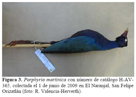 Su distribución es desde el sureste de EUA y México hasta el norte de Chile y norte de Argentina; en México es residente en ambas vertientes desde Nayarit y Tamaulipas hasta Chiapas, Tabasco, Campeche y Quintana Roo (Howell y Webb 1995). El 1 de junio de 2009, RHH y JVH recuperaron un ejemplar de una hembra adulta de gallineta morada en la localidad El Naranjal, San Felipe Orizatlán (21°12'10"N, 98°34'53"O; 174 msnm), el lugar presenta una porción inundable con pastizal ganadero. El individuo de P. martinica está depositado en la Colección de Aves del Instituto Tecnológico de Huejutla, con el número de catálogo H-AV-365 (Figura 3). El ejemplar no presentó muda y los datos merísticos son: peso 250 g; culmen 28 mm, cuerda alar 173 mm, cola 70 mm y tarso 70 mm.