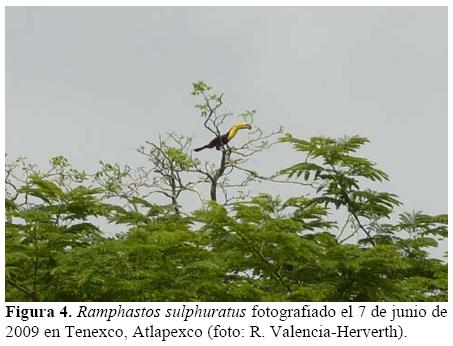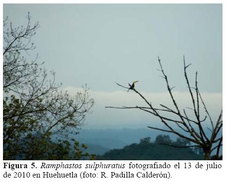 Se distribuye en los bosques tropicales húmedos desde el este de México hasta el norte de Colombia y noroeste de Venezuela; en México se le encuentra por la vertiente del Golfo desde San Luis Potosí hasta Yucatán y Chiapas en la frontera con Belice y Guatemala (Miller et al. 1957, Howell y Webb 1995). El 7 de junio de 2009, RVH, JVH, MON y MON observaron una pareja de tucanes pico canoa desde las 09:27 hasta las 12:00 h. Los individuos estaban forrajeando frutos de árboles de jalamate (Ficus cotinifolia, Moraceae) y vocalizando constantemente en el dosel. Se logró filmar la pareja (HAV-370) y fotografiar a un individuo (Figura 4). La localidad se ubica en el ejido Tenexco, a 7.2 km al noreste de la cabecera municipal de Atlapexco (21°04'48"N, 98°19'05"O; 111 msnm), en una zona de potrero con manchones interconectados por bosque tropical perennifolio poco perturbado. El 11 de mayo de 2010, JVH observó un individuo durante 15 min en el río los Hules, a 1 km de la localidad de Congreso Permanente Agrario, Huejutla de Reyes (21°07'24.52''N, 98°16'54.92''O; 92 msnm). El 20 de junio de 2010, JVH observó un individuo en un fragmento de bosque tropical cercano a la localidad de Tohuaco I, Huautla (21°05'33''N, 98°15'49''O; 160 msnm). El 13 de julio de 2010, RPC observó una parvada de cuatro individuos perchados en un árbol seco, de los cuales fotografió a un individuo (Figura 5) en la Barranca del Río Beltrán (límite entre los municipios de Huehuetla y San Bartolo Tutotepec), a 2 km de la localidad de San Esteban, Huehuetla (20°33'28''N, 98°04'13''O; 720 msnm). Este sitio presenta bosque tropical perennifolio bien conservado. En posteriores visitas, durante el 2011, se observaron y escucharon varios individuos en la misma barranca del 5 al 7 de agosto y del 24 al 26 de septiembre.