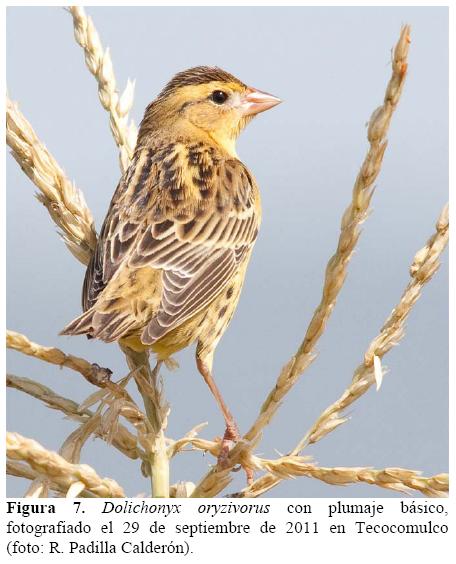 A diferencia de las otras especies aquí listadas como nuevos registros para Hidalgo, D. oryzivorus no estaba considerada como especie hipotética (Martínez-Morales et al. 2007) debido a que su área de distribución normal en México es en el noreste de la Península de Yucatán, como especie transitoria irregular (Howell y Webb 1995). Sin embargo, existe un registro de mayo de 1986 cercano a la costa en el centro de Veracruz (Howell y Webb 1995) y recientemente se le ha registrado en Oaxaca (McAndrews y Montejo 2010). Nosotros documentamos el primer registro de la especie para el centro del país, aunque sugerimos que su presencia debe considerarse como vagabunda y con escasas posibilidades de volver a ser documentada en Hidalgo.