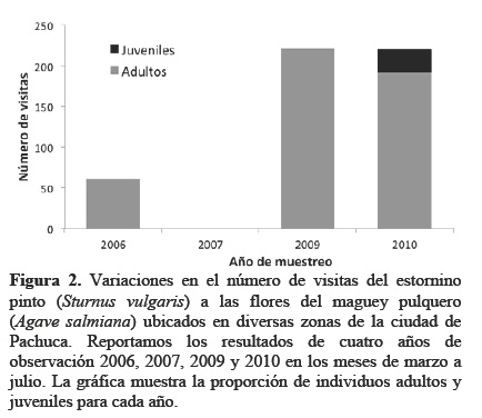 En 340 h de observación registramos 502 visitas del estornino pinto a las flores del maguey (Figura 1). El número de visitas registradas durante las cuatro horas de observación en cada inflorescencia fue muy variable, de 0 a 178 visitas. Del total de visitas, 473 (94.2%) fueron realizadas por adultos reproductivos y las 29 restantes (5.8%) fueron realizadas por individuos juveniles; no observamos adultos no reproductivos. El número de visitas del estornino pinto también varió entre los diferentes años de observación: en 2006 registramos el 12% de las visitas, en 2007 no registramos la especie, en 2009 registramos el 44.0% de las visitas y en 2010 el 43.8% (Figura 2). Sólo en 2010 observamos juveniles que en total representaron el 15.2% de las visitas de ese año (Figura 2). El 71.9% de las visitas estuvieron relacionadas con consumo de néctar. En todos los casos de forrajeo de néctar, los estorninos ubicados encima de las flores introdujeron el pico en la flor y agitaron la cabeza; en diversas ocasiones repitieron el mismo comportamiento en otras flores. Al terminar de forrajear, se desplazaron a una panícula del mismo maguey en donde sacudieron la cabeza, se acicalaron y en algunas ocasiones emitieron vocalizaciones. En 2010, observamos interacciones entre dos estorninos que incluyeron acercamientos, toques con los picos y vocalizaciones, conductas que pueden interpretarse como de cortejo.