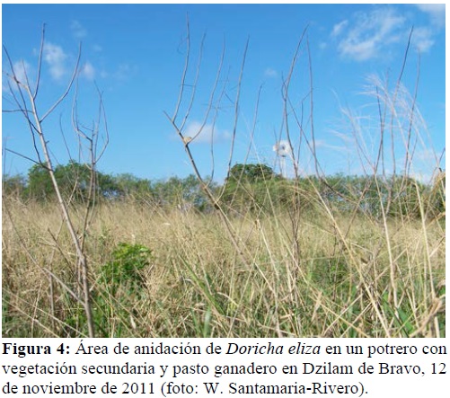 El 18 de septiembre observamos, por 30 seg, un macho de D. eliza posado en una rama seca a la orilla de un camino de terracería; después voló tierra adentro como a unos 150 m donde se posó en una rama. El 9 de octubre registramos un macho posado en una rama seca sobresaliente cerca del sitio donde lo observamos por primera vez. El 15 y 16 de octubre observamos un macho posado en una hoja de Agave angustifolia. El 22 de octubre registramos por primera vez a una hembra posada en una hoja de A. angustifolia como a 50 m de distancia de donde observamos al macho. Al día siguiente, observamos una hembra posada en la hoja de A. angustifolia aproximadamente a 1 m de altura, la hembra se acicalaba. El 6 de noviembre observamos una hembra alimentándose de las flores de Malvaviscus arboreus, aproximadamente a 500 m de distancia de los otros registros. El 12 de noviembre observamos a una hembra posada en su nido con dos huevos construido en una rama sin hojas de Leucaena leucocephala a 2 m de altura por encima del pasto y dentro de un potrero ganadero (Figura 5). El 13 de noviembre observamos a la hembra incubando los huevos. Este día fue el último conteo en el área, motivo por el cual no le dimos seguimiento al nido.