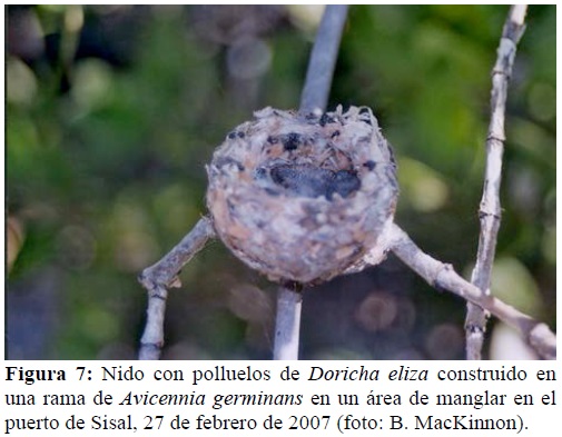 Otro registro ocurrió el 1 de enero de 2007 en el puerto de San Crisanto (21°21'08"N, 89°10'28"O), en donde observamos un nido colocado en una rama seca de un arbusto de Ricinus communis (Figura 6) a 1 m de altura y a escasos 2 m de la orilla de la carretera costera. El nido, contenía trozos de pintura como material de construcción y un huevo que era incubado por una hembra. El 27 de febrero de 2007, observamos otro nido con dos polluelos en un árbol de Avicennia germinans a 2 m de altura (Figura 7) en el puerto de Sisal (21°09'32"N, 90°02'56"O).
