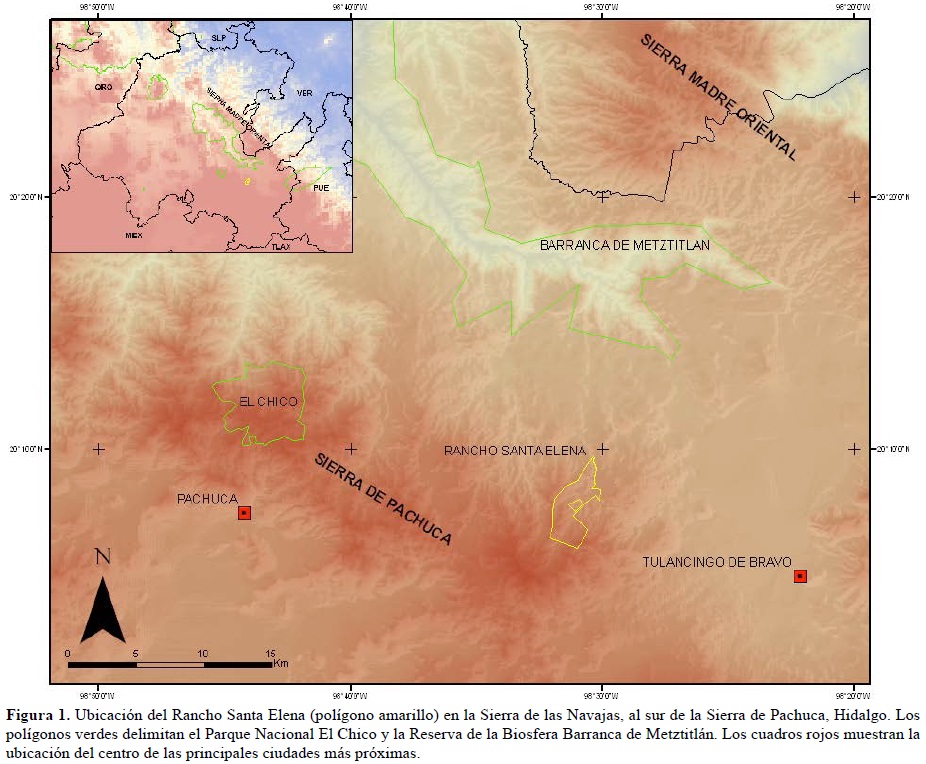 El RSE es un conjunto predial de poco más de mil hectáreas ubicado al este de la Sierra de las Navajas, en el estado de Hidalgo (Figura 1). La variación altitudinal va de los 2240 a los 2980 m snm. Prácticamente la totalidad del RSE está cubierto por bosques de pino-encino y encino nativos, siendo las principales especies arbóreas Pinus patula, P. teocote, P. pseudostrobus, P. ayacahuite, P. montezumae, P. greggii, P. rudis, Quercus crassifolia, Q. laurina, Q. rugosa, Quercus spp., Arbutus xalapensis, A. glandulosa, Juniperus flaccida y Juniperus spp. También están presentes algunos manchones de oyamel, Abies religiosa, en las partes más altas, y el aile, Alnus jorullensis, ocurre en la vegetación ribereña. Existe vegetación nativa arbustiva y herbácea asociada a sitios con suelos someros o con roca expuesta o bien, a sitios en algún estado sucesional después de la remoción del bosque. Adicionalmente, existen poco menos de 50 ha de plantaciones o reforestaciones con especies nativas de pino. Están presentes tres embalses, siendo el más importante la presa San Carlos; así como dos corrientes de agua anteriormente permanentes que se originan de manantiales. Desde 2009 está vigente un programa de aprovechamiento forestal a 10 años que incluye el aprovechamiento de rodales de bosque nativo y de plantaciones sobre una superficie de 300 ha. En 2012, este aprovechamiento forestal fue evaluado satisfactoriamente mediante una auditoría técnica, como un paso previo a su certificación. También, desde 2009, y por 5 años, se han destinado 190 ha a la provisión de servicios ambientales hidrológicos dentro del programa ProÁrbol de la Comisión Nacional Forestal. El RSE está registrado como una unidad de manejo para la conservación de la vida silvestre (UMA extensiva) para el aprovechamiento sustentable de algunos de sus recursos forestales no maderables, aunque a la fecha no se ha realizado ningún tipo de aprovechamiento extractivo. Las principales actividades productivas que se llevan a cabo, además del aprovechamiento forestal, son el ecoturismo, la educación ambiental, el deporte de aventura, la conservación y la investigación y docencia. En 2011, se firmó un convenio con la Universidad Nacional Autónoma de México para desarrollar investigación y realizar actividades de docencia en el RSE.