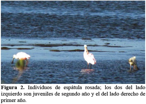 Observamos dos individuos de segundo año en la parte noreste del estero, estos individuos estaban junto con un individuo de primer año (Figura 2). En los individuos de segundo año, aunque sus patas tienen un color rosa intenso, el plumaje del cuerpo es aun de un tono rosa claro. El individuo de primer año no presentaba ninguna coloración rosada y todo el plumaje del cuerpo era blanco; además, las patas no tenían la coloración rosa de los individuos de segundo año (Sibley 2000, National Geographic Society 2002). Durante los avistamientos, estas aves estaban alimentándose y las observamos durante dos horas más hasta que se alejaron. A una distancia de aproximadamente 50 m de las tres primeras espátulas, observamos dos individuos más, también en comportamiento de alimentación (Figura 3). Por la coloración rosada de su plumaje y el rosa intenso de sus patas, los dos individuos los consideramos de segundo año (Sibley 2000, National Geographic Society 2002).