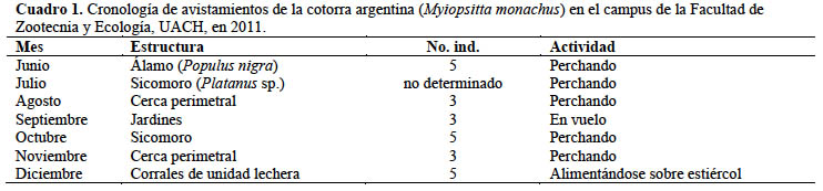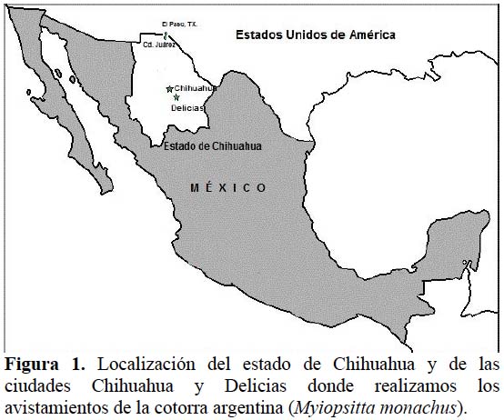 La cotorra argentina (Myiopsitta monachus) es originaria de América del Sur; su distribución incluye Argentina, Bolivia, Brasil, Paraguay y Uruguay (NatureServe 2007). Habita bosques, matorrales, sabanas y zonas rurales en su área de distribución nativa (Aramburú y Corbalán 2000). En sistemas urbanos, esta especie se ve favorecida por la presencia de árboles exóticos altos como eucaliptos, pinos, cipreses y palmas donde construyen sus nidos, así como también en postes y transformadores de corriente eléctrica (Román-Muñoz y Real 2006). La cotorra argentina ha ampliado su distribución como resultado de liberaciones accidentales o deliberadas en países europeos como Inglaterra (Dale 1979, Butler 2005), Francia, Holanda, España (Battlori y Nos 1985, Murgui y Valentín 2003, Vidal 2004, García 2007), Italia (Maranini y Galuppo 1994) y Suiza (Krebser 1963). En el continente Americano, su distribución se ha ampliado a EUA (Neidermyer y Hickey 1977, Van Bael y Pruett-Jones 1996, Butler 2005), Bahamas, Puerto Rico (Spreyer y Bucher 1998) y México (Pablo-López 2009, Pineda-López y Malagamba-Rubio 2011, MacGregor-Fors et al. 2011, Guerrero-Cárdenas et al. 2012). En México, Chávez (1999) reportó el primer avistamiento de la especie en el vaso regulador El Cristo, en el Estado de México. Se han reportado también, avistamientos en los estados de Oaxaca (Pablo-López 2009), Querétaro (Pineda López y Malagamba-Rubio 2011), Michoacán (MacGregor-Fors et al. 2011) y Baja California (Guerrero-Cárdenas et al. 2012). Además, se deduce que la especie pueda existir o colonizar zonas urbanas fronterizas cercanas a El Paso, Texas (Ciudad Juárez), donde se estableció desde 1986 (Patton y Zimmer 1996). La presencia de la cotorra argentina no se había confirmado en los estados de Chihuahua y Sonora (Álvarez-Romero et al. 2008, MacGregor-Fors et al. 2011), aunque el portal electrónico aVerAves <www.averaves.org> contiene un reporte de avistamiento de un individuo, en enero de 2011, en el rancho ecológico El Uno, al noroeste del estado de Chihuahua, a aproximadamente 225 km al suroeste de El Paso, Texas.