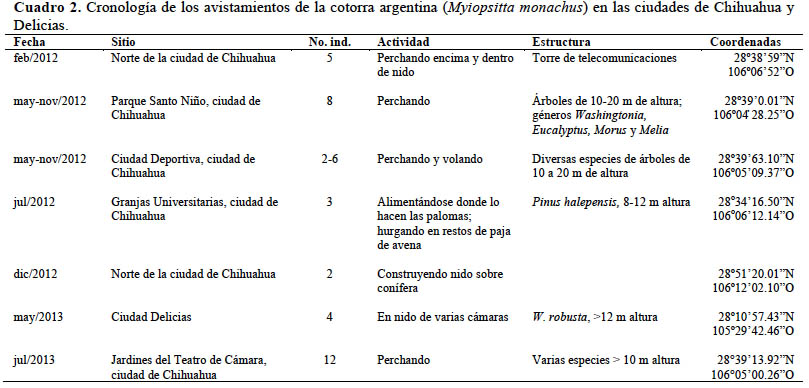 Reportamos el primer registro de la cotorra argentina (Myiopsitta monachus) en las ciudades de Chihuahua y Delicias en Chihuahua, México. Observamos cinco individuos de esta especie de junio a diciembre de 2011 en las instalaciones de la Facultad de Zootecnia y Ecología de la Universidad Autónoma de Chihuahua; grupos de 2 a 12 individuos en el área urbana de la ciudad de Chihuahua durante 2012, y cuatro individuos en ciudad Delicias, a 80 km al sureste de la ciudad de Chihuahua, en el 2013. Previamente, en enero de 2011, se reportó, en el portal electrónico de aVerAves, el avistamiento de un individuo en el noroeste del estado. Dada la presencia de nidos activos en las ciudades de Chihuahua y Delicias, la especie podría estar ya establecida en esta parte del país. Recomendamos dar seguimiento a las poblaciones existentes de esta especie a fin de documentar los posibles riesgos a los ecosistemas en la región.