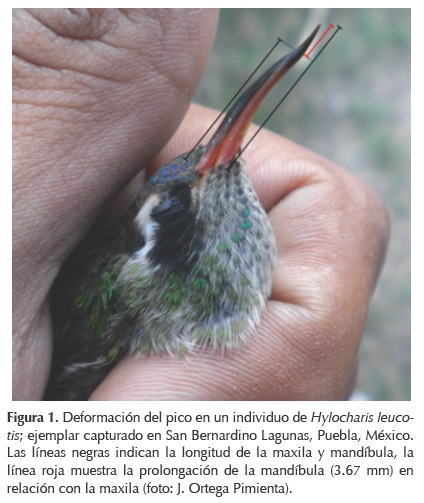 El 1 de junio de 2012 capturamos un individuo macho con plumaje juvenil del colibrí oreja blanca (Hylocharis leucotis) con notoria elongación de la mandíbula y un ligero recurvamiento hacia arriba en la punta del pico (Figura 1). El colibrí oreja blanca se caracteriza por el color rojo y negro en el pico; en el maxilar superior el rojo va desde la base hasta la parte media, mientras que en el maxilar inferior (o mandíbula) este color se prolonga más hacia la punta; el color negro coincide en ambos maxilares en la punta del pico. En el individuo que capturamos, el color negro en la punta del maxilar inferior se encontraba desfasado respecto a la coloración del maxilar superior (Figura 1). El pico de esta especie mide en promedio 16.76 ± 0.15 mm, n=15 (Morales et al. 2012); en contraste, el maxilar superior del individuo capturado estaba por debajo del promedio (i. e., 14.87 mm) y el maxilar inferior por encima de él (i. e., 18.54 mm; Figura 1). El colibrí no tenía el plumaje dañado y no observamos lesiones en ningún lugar del cuerpo. Después de haber tomado las medidas corporales liberamos al individuo en el mismo sitio en el que fue capturado.