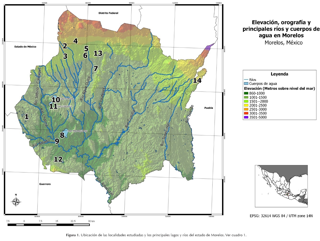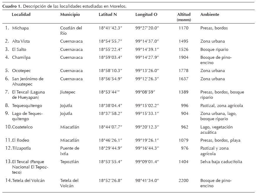 Presento información obtenida en 14 localidades del estado de Morelos (Figura 1, Cuadro 1). Los registros que reporto en esta nota se ubicaron principalmente en la mitad oeste del estado. Las altitudes de las localidades de los registros fueron de los 900 y a los 2,200 msnm. Los ambientes fueron zonas agrícolas, zonas urbanas, bosque ripario, bosque de pino-encino, pastizal y selva baja caducifolia. En el ambiente acuático los registros se hicieron en vegetación acuática, lagos, playas, presas y bordos.