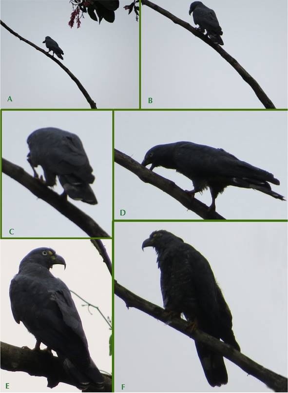 Figura 1 (A-F) Gavilán pico gancho macho adulto con plumaje eumelánico alimentándose de un caracol gigante africano, se puede notar una sola línea blanca en la cola, que caracteriza a los adultos. Sector La Loma, provincia de El Oro, sur de Ecuador (fotos: Salomón Ramírez, 6/10/2017).