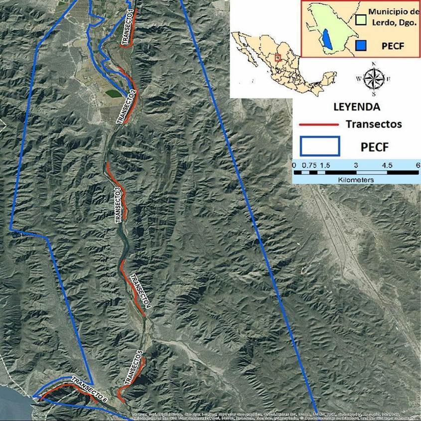 El Parque Estatal Cañón de Fernández (PECF) es un Área Natural Protegida y sitio Ramsar (1747), localizado al noreste del estado de Durango, México. El parque se ubica al extremo sur del municipio de Lerdo, a 62 km de la ciudad de Lerdo (25°20’16.7” N 103°43’55.6” O). Este sitio tiene una superficie de 17,000 ha con climas semiseco, semicálido, seco templado y templado subhúmedo. El PECF se encuentra dentro de la región del desierto chihuahuense, el cual presenta un nivel de biodiversidad muy alto y escasamente estudiado (Waeuer y Riskind 1977). Además, el PECF es considerado parte de un corredor biológico entre el desierto y los bosques de la Sierra Madre Occidental (Ramsar 2007). Así mismo, esta área es parte de la ruta central migratoria de aves en Norteamérica (Medellín 2009, Berlanga y Rodríguez 2010). El PECF también posee alta biodiversidad, incluidas las especies vulnerables y en peligro de extinción, por su variedad de hábitats y la presencia de un humedal de importancia internacional, formado por el río Nazas en medio del desierto (Valencia 2003, Ramsar 2007, Figura 1).