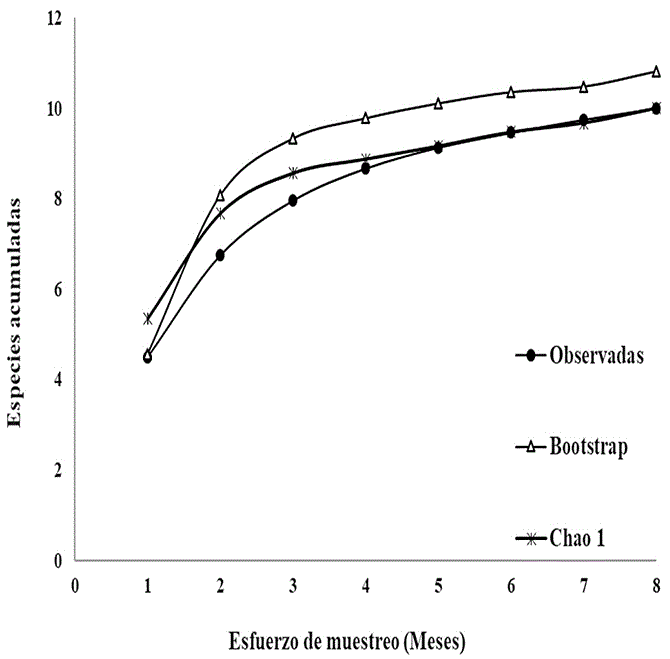 Para determinar si el esfuerzo de muestreo fue suficiente para detectar la mayoría de las especies existentes realizamos curvas de acumulación de especies; usamos los índices Chao 1 y Bootstrap, mediante el programa Estimate versión 9.1.0 (Colwell 2013), y consideramos cada mes como un muestreo.