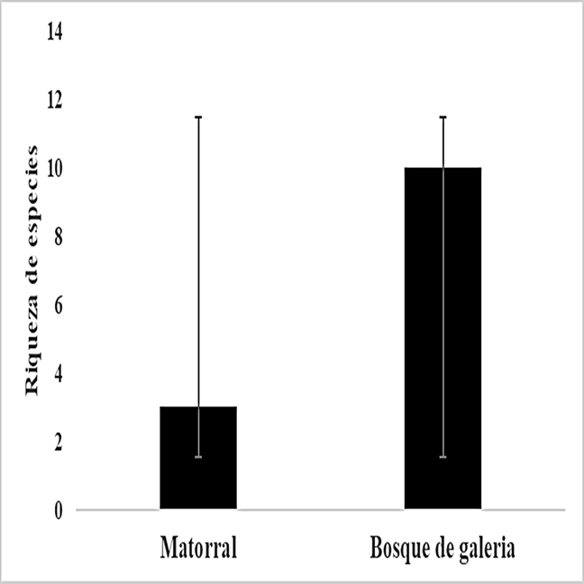 La riqueza en bosque de galería fue de 10 especies y para el matorral 3; estadísticamente hay diferencias significativas entre ambos sitios (U=10, P=0.002; Figura 4). Para la riqueza por estación del año en el bosque de galería encontramos diferencias (H=6.863, P=0.057; Figura 5), entre primavera y otoño (0.032) y entre verano y otoño (0.020). El valor de complementariedad entre ambos sitios (bosque de galería y matorral) fue de CAB= 0.7 o 70%.
