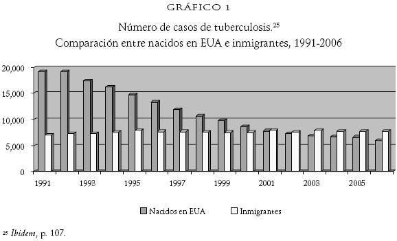 24 Véase CDC, Reported Tuberculosis in the United States. Mycobacterium Tuberculosis, 2006. Atlanta, U.S. Department of Health and Human Services, CDC, Septiembre 2006. Sobre la epidemiología de la tuberculosis en la frontera de México y Estados Unidos véase Schneider, Eileen, Kayla F. Laserson, Charles D. Wells et al, <<Tuberculosis along the United StatesMexico border, 19932001>>, Rev Panam de Salud Pública, julio de 2004, vol. 16, núm. 1, pp. 2334, también en http://www.scielosp.org/scielo.php?script=sci_arttext&pid=S102049892004000700004&lng=en&nrm= iso.