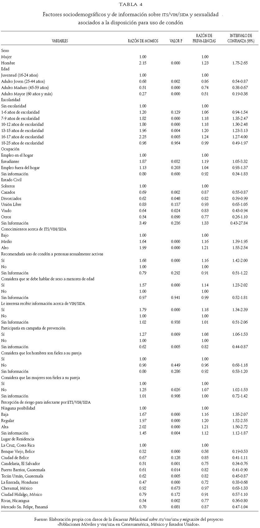 La razón de prevalencias (RP) muestra que los hombres están más dispuesto a usar condón que las mujeres (1.23) Al incrementar la edad del individuo disminuye la disposición a usar condón; la diferencia entre grupos de edad fue estadísticamente significativa (p<0.05). Respecto al estado civil, se observó que los casados, los divorciados y los viudos tienen menor disposición a usar condón que los solteros.