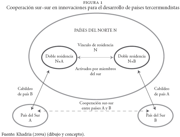 Una de las formas de avanzar de manera concreta hacia sostener la demanda de retiro garantizado de estos dos elementos clave de la práctica sería, posiblemente, que los países del sur no solamente pensaran, sino que demostraran una cooperación sur-sur, es decir, solidaridad en la creación de sistemas de innovación dentro del sur mismo. Las posibilidades de nuevas configuraciones como BRIC o las configuraciones emergentes similares a lo que Khadria (2010) llamaría las economías emergentes del sur (RSE en inglés), es decir, BRIC más Sudáfrica y México, podrían representar una base nueva para las expectativas sobre la cooperación sur-sur en innovaciones de lo que denomina el modelo de desarrollo de países del tercer mundo en materia de migración.