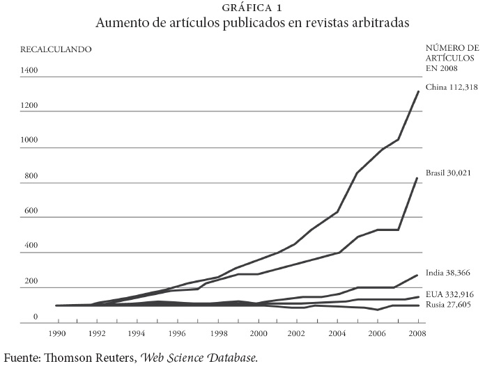 Aunque Estados Unidos todavía publica, en 2008, una cantidad tres veces mayor que China, nueve veces mayor que India y 11 veces mayor que Brasil sobre la ciencia dominante internacional, la diferencia en las tendencias es sorprendente (Cookson, 2010): la estabilidad, por un lado, y el crecimiento notable, por el otro.