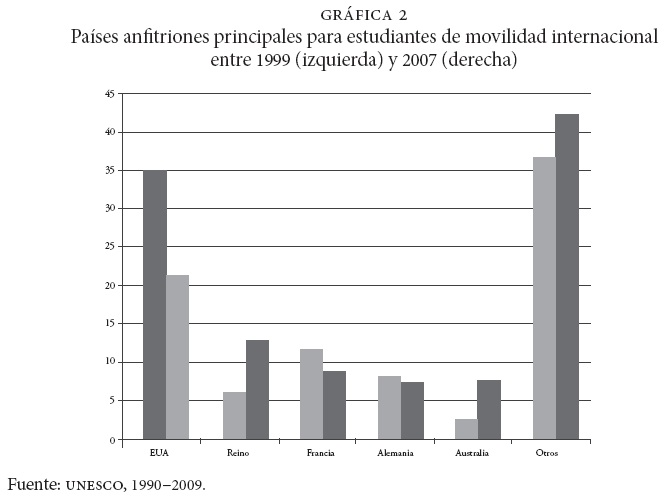 Este era un sistema estable alimentado, mantenido y reforzado por la distribución asimétrica de educación superior equivalente y paralela alrededor del mundo. Los proveedores más importantes de títulos universitarios, así como los imanes más fuertes de estudiantes extranjeros, se encontraban en los países de la tríada, principalmente en Estados Unidos y en países de Europa Occidental como Francia, Alemania y Reino Unido. Solamente en éstos se concentraba más de la mitad de los flujos (ver tabla 6 y gráfica 1).