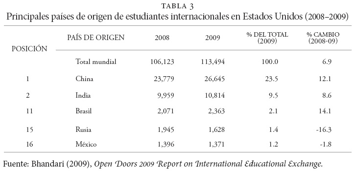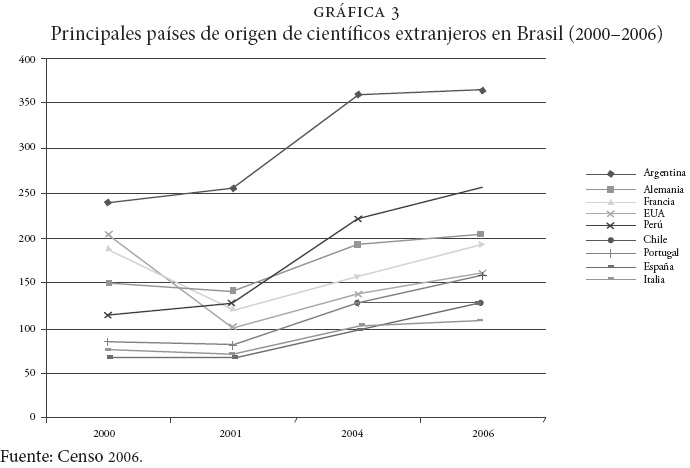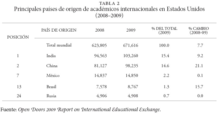 La expansión esperada de la población estudiantil proveniente de India y China en países occidentales sin duda irá a la par de los flujos recientes hacia los dos países asiáticos (EU, 2009). Este fenómeno ya puede apreciarse en las últimas estadísticas globales de educación superior de la Organización de las Naciones Unidas para la Educación, la Ciencia y la Cultura (UNESCO) (ver gráfica 2). Pero, más allá de los estudiantes, y no solamente en Asia, la atracción nueva hacia polos emergentes se evidencia por medio de anécdotas y estadísticas particulares. La Academia de Ciencias de China anunció, por ejemplo, que pretende atraer mil 500 científicos extranjeros de alto nivel para una estancia temporal o duradera para colaborar en proyectos de investigación conjunta. Mientras tanto, el programa 100-Talent, que ya atrajo a más de mil 300 científicos chinos de regreso a su país, continúa creciendo (Zhiguo, 2009). Del mismo modo, en Brasil país que atrae a una multitud de estudiantes avanzados latinoamericanos está viviendo un aumento en la entrada de científicos extranjeros; mientras el número total ha aumentado en 30% entre 2000 y 2006, de 2105 a 2733, la cantidad de europeos en conjunto con los vecinos americanos sigue elevándose rápidamente (Nunes y Bautista, 2010).