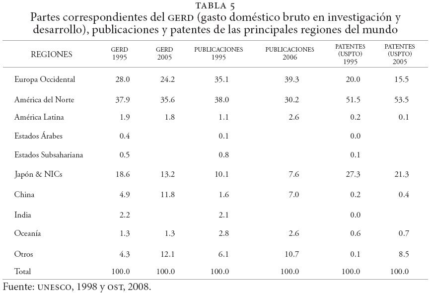 Hasta el año 2000, los cienciometristas (especialistas en estadística sobre ciencia y tecnología) solían decir que el mundo estaba dominado por la llamada tríada, conformada por América del Norte, Europa occidental y Japón (UNESCO, 1998). Los indicadores de entrada y salida mostraban un contraste agudo entre este conjunto de países y el resto del mundo. Las inversiones que se hicieron en investigación y desarrollo, así como las publicaciones y patentes, se concentraron masivamente en tres bloques principales (ver tabla 5).