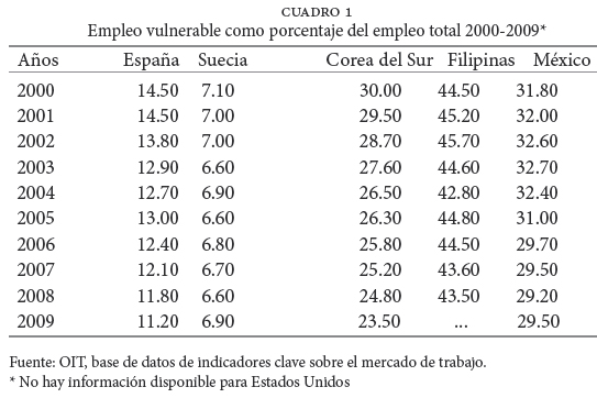 De acuerdo con el cuadro 1, Filipinas presenta el mayor porcentaje de empleo vulnerable, reduciéndose en un punto porcentual entre 2000 y 2009; le sigue México, con una disminución de 2.3%, mientras que Corea del Sur logra reducir el empleo vulnerable en un 6.5% para el mismo periodo; en Suecia y España, el porcentaje de personas con empleo vulnerable es muy inferior, especialmente el de Suecia.