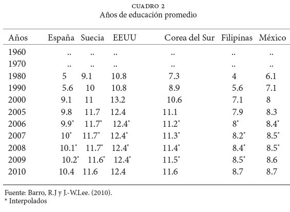 El desarrollo económico está vinculado a los niveles de capital humano en la población; éstos pueden medirse a través del mejoramiento en el nivel educativo. Las economías más desarrolladas cuentan con una población que presenta elevados niveles de estudio, situación que les ha permitido incorporarse a lo que se conoce como "economías del conocimiento", donde el conocimiento es fundamental para generar valor y riqueza. En el cuadro 2 se observa que los años promedio de educación han sido superiores en los países más desarrollados (Estados Unidos y Suecia), mientras que España y Corea del Sur han realizado un gran esfuerzo por incrementar los niveles de educación en su población, al grado que se ubican muy cerca de las economías más avanzadas. México y Filipinas están todavía lejos de alcanzar los niveles de las economías desarrolladas, ya que, en comparación con estas, presentan de tres a tres años y medio menos de estudio.