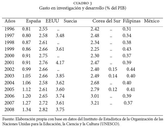 Las economías desarrolladas que están inmersas en la economía del desarrollo implementan estrategias de inversión en Investigación y Desarrollo (I+D), las cuales permiten que la población altamente educada se desenvuelva en entornos adecuados. En el cuadro 3 se observa que, desde 1996, Corea del Sur ha incrementado el porcentaje de gasto que destina a I+D, porcentaje muy superior a los de México y Filipinas; incluso ha incrementado su gasto a niveles superiores a los presentados por Estados Unidos y los presenta muy cercanos a los de Suecia. España, por su parte, muestra también un aumento considerable de su gasto en actividades de I+D.
