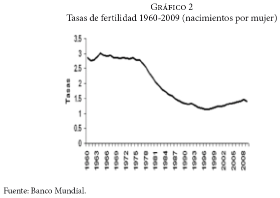 España logró revertir su tendencia migratoria en los años noventa gracias al dinamismo en la generación de empleos impulsados por los fondos de la CEE, los cuales se enfocaron al desarrollo económico. Aunado a esto, tenemos las dificultades demográficas por las que atraviesa España: la tasa de fertilidad se ha situado por debajo del nivel de reemplazo dos nacimientos por mujer desde la década de 1980 y ha mantenido su descenso hasta alcanzar, en 2009, la cifra de 1.4 nacimientos por mujer. Estos elementos nos permiten explicar este cambio en el patrón (gráficos 2 y 3).