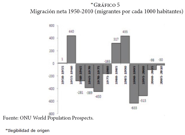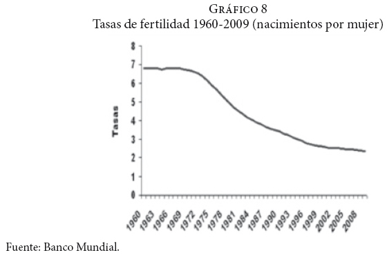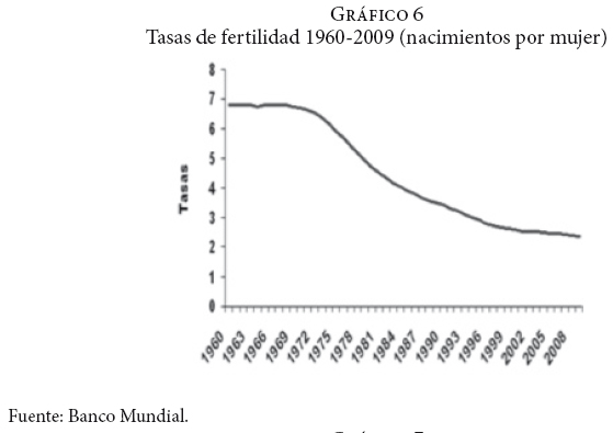 Durante la década de 1990, el desempleo creció ligeramente hasta un punto en el que se disparó y llegó a alcanzar un 6.9% en 1995, año marcado por la profunda crisis económica. Entre 1996 y 2000, se presentó una caída en la tasa de desempleo debido al impulso de las exportaciones y a la entrada de inversión extranjera que estableció una industria maquiladora. De acuerdo con datos del Banco Mundial, a partir de 2001 la tasa de desempleo creció gradualmente, pasando de un 2.5 a un 3.5%, en 2008 y llegando a 5.2% en 2009. Esto indica que el modelo neoliberal no ha generado los empleos suficientes para absorber los contingentes internos de mano de obra, lo cual permite comprender por qué México continúa siendo un país expulsor de trabajadores. Por otra parte, a pesar de que la tasa de fertilidad se ha reducido constantemente desde 1960, la emigración neta se ha incrementado durante este mismo periodo debido a que el crecimiento económico en México no ha mostrado el dinamismo necesario para generar los empleos formales suficientes que permitan la incorporación al mercado laboral de sus excedentes en mano de obra (gráficos 6 y 7).