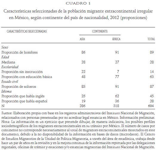 This article intends to answer three central questions: What is extra-continental migration? Who are the migrants that make up this migratory flow? and, What is Mexico doing to address this phenomenon? To that end, we analyze the key extra-continental migratory flows originating in Africa and Asia that are directed toward Mexico; certain socio-demographic characteristics, routes and migratory strategies; as well as some of the challenges that this flow represents to the management of migration. Concluding the article, we present some possible lines of action for the design of migratory policy. These proposals are based on statistical information from administrative registries on migrants maintained by the National Migration Institute (INM) as well as complementary information sources.