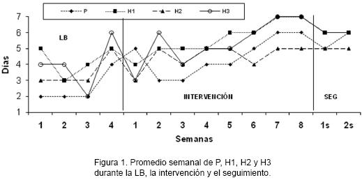 Finalmente durante las ocho semanas de intervención se pudo observar lo siguiente: durante los 55 días de intervención, P y H2 asistieron durante 36 días, H3 en 43 ocasiones y H1 con 45 asistencias.