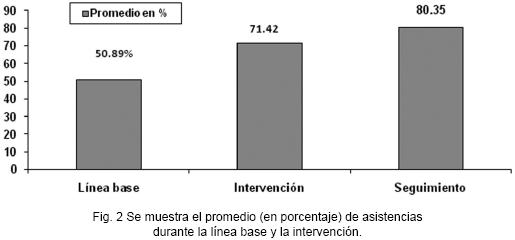 Por otro lado, el promedio total de asistencias durante la intervención fue 40 asistencias, siendo igual a un 71.42% de asistencias (ver figura 2 ). Se puede observar que en el promedio total, hubo un aumento del 20.53% de asistencias de la LB a la intervención. Y el promedio total de asistencias durante las dos semanas de seguimiento fue de 80.35%, lo que indica que de la LB al seguimiento aumentaron las asistencias casi un 30%.
