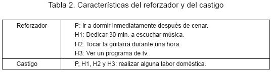 Se aplicaba un reforzador positivo cuando se asistía a la cena. Para esto, el aviso de M llamando al resto de la familia a la mesa era el momento que daba inicio a la cena. El reforzador fue diferente para cada uno de los miembros de la familia, pues se consideraron los intereses de cada uno (ver tabla 2). Si era factible, el reforzador se daba inmediatamente después de la cena, o si no al día siguiente.