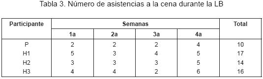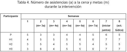 A partir del día 29 dio inicio a la intervención. Esta duró 56 días continuos. Aquí inició la aplicación de las metas semanales, de los reforzadores y los castigos. En la Tabla 4 se muestran los promedios de asistencia a la cena de P, H1, H2 y H3 durante las 8 semanas que duró la intervención.