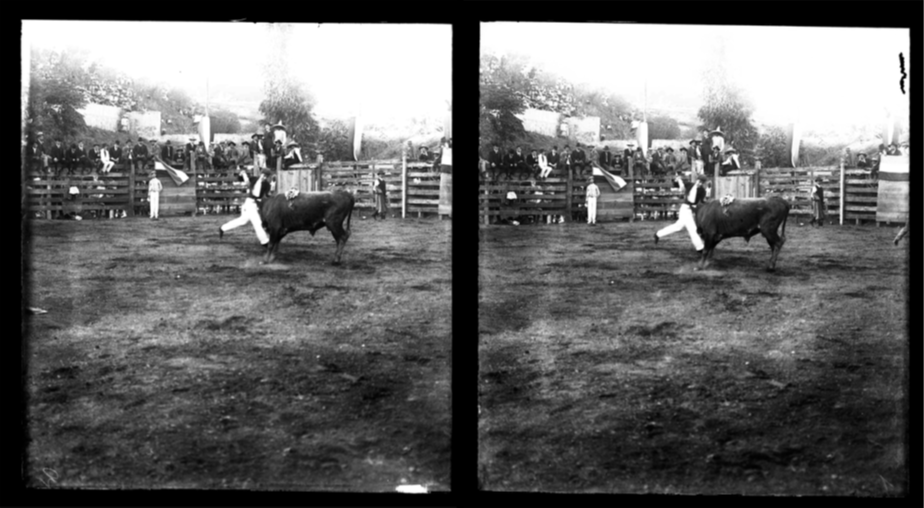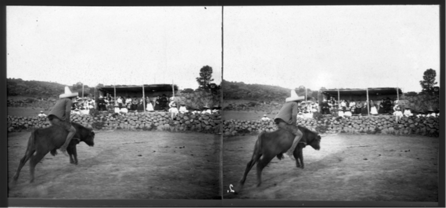 Dos instantáneas más con el tema de la charrería fueron localizadas en la Fototeca Romualdo García. Se trata de negativos estereoscópicos datados en 1910, de un autor no identificado. La primera es la captura en un desfile en lienzo charro en Guanajuato, mientras que en la segunda imagen el fotógrafo capturó la ejecución de la suerte charra llamada “de colas” o “coleo”. Ésta consiste en la liberación de un toro al inicio de la “manga” del lienzo, que es una galería recta de 60 metros de longitud. En ella, el jinete montado sobre su caballo debe derribar al toro enroscando la cola del animal en su propia pierna, y jalarlo hasta derribarlo. Era la suerte más esperada de toda la fiesta ya que era ejecutada por los “patrones”, o por los dueños de los equipos de charros que competían, ya que era una de las suertes menos peligrosas. Nuevamente, el fotógrafo disparó justo antes de que el jinete derribara al toro, y al dar prioridad a eso, descuidó otros elementos de control de la toma.