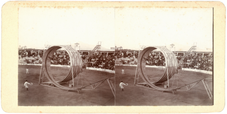 La rampa sobre la que el ciclista realizaba la acrobacia era sostenida por una estructura desmontable de aproximadamente diez metros de altura. El bucle de 360° aterrizaba a la altura del piso. Una captura anterior a esta fotografía presenta al acróbata sin correr su bicicleta, a un lado de la estructura. Fue en la segunda imagen donde ocurre la acción: el acróbata descendió la rampa desde el punto más alto para ganar velocidad y avanzar sobre el bucle. El maestro de ceremonias, de pie a la izquierda de la pista, tiene su sombrero en la mano. Apoyado sobre su única pierna y una muleta, nos introduce en la escena con su gesto y parece mirar azorado al ciclista.