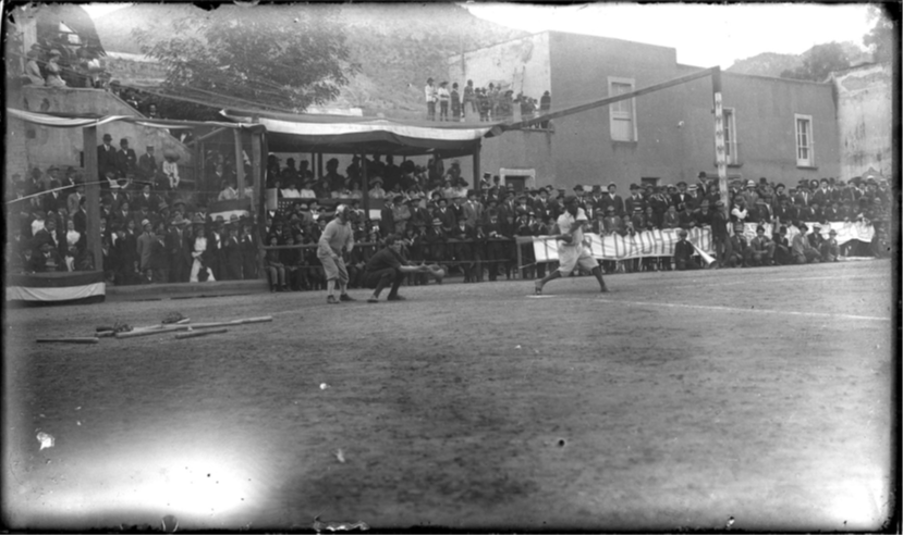 En Guanajuato, un partido de béisbol fue fotografiado en formato panorámico por un personaje anónimo en una placa seca. En la valla que delimitaba el campo de juego, un grupo de hombres sostenía una pancarta que apoyaba al “Club Cuauhtemoc Guanajuato”. El partido debió realizarse en el contexto de las fiestas de Independencia, ya que en la decoración del lugar estaba presente la bandera mexicana y el escudo nacional; mientras que, por otro lado, una bandera estadounidense colocada en las graderías manifestaba la presencia y participación de colonos americanos.