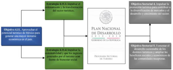 No obstante, el retroceso que en el sistema económico global presenta el turismo de México, el gobierno actual lo posiciona en el plan sectorial como uno de los ejes rectores para el desarrollo y, entre otras estrategias, considera promover una mejor planeación territorial de su práctica con la finalidad de mejorar la calidad de vida de la población (Figura 1).