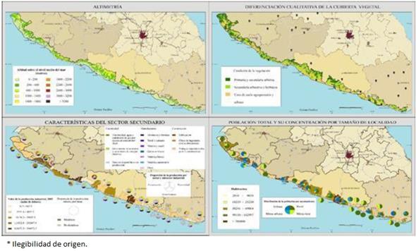 Con esta información se elaboró una amplia cartografía temática: 30 mapas principales, 33 mapas secundarios, siete cuadros y diez gráficos. De esa forma fue posible sintetizar numerosos datos relativos al primer decenio del siglo XXI y, derivado de esta caracterización, se obtuvo un diagnóstico sobre la individualidad geográfica que posee esta porción del territorio nacional (Figura 2).