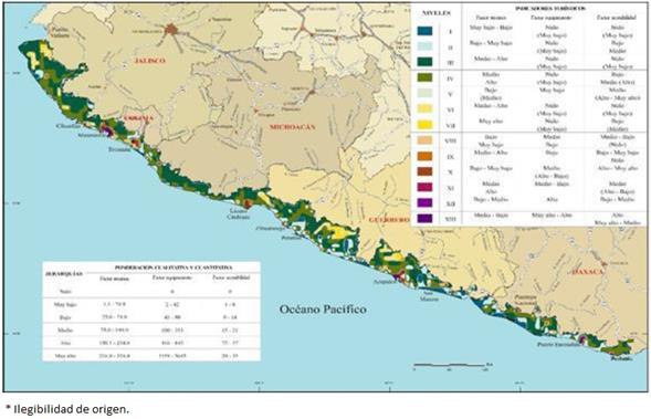 El mapa proporciona información en torno a las decisiones que en materia de política turística pueden realizarse. Al respecto, los niveles I y II constituyen territorios donde existe poca diversidad de recursos turísticos y es mínimo o inexistente el equipamiento para atender a posibles visitantes. En cuanto a los niveles III, IV, V, VI y VII, representan a espacios en los que la disposición de elementos naturales y culturales aumenta gradualmente y la accesibilidad por vía terrestre permite el traslado de los turistas. Sin embargo, es incipiente y de baja calidad el equipamiento y los servicios turísticos. A su vez, los niveles VIII, IX y X, integran a zonas aledañas o cercanas a los principales mercados turísticos de la región, cuentan con atractivos turísticos alternativos y un número considerable de establecimientos de comida y hospedaje para atender las necesidades básicas de los turistas. Por su parte, el nivel XI es propio de los destinos turísticos emergentes que fortalecen a esta actividad económica dentro de la región, por lo cual compiten con los principales centros de ocio y recreación. Por último, los niveles XII y XIII son atribuibles a los proyectos turísticos diseñados por el gobierno federal y las administraciones de los estados de Jalisco, Colima, Guerrero y Oaxaca para atraer flujos significativos de turistas nacionales e internacionales.