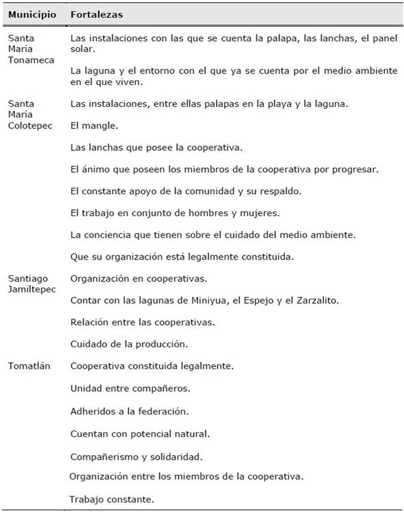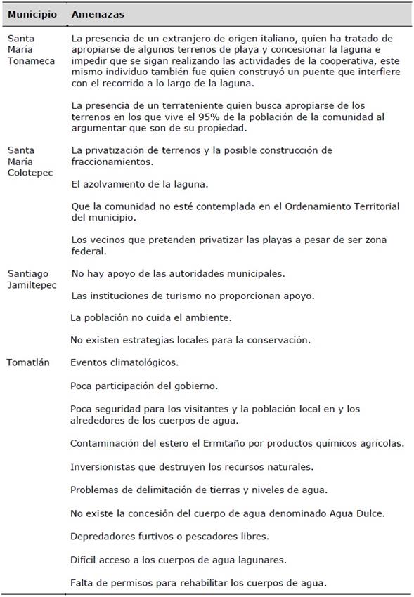 En cuanto a las debilidades que pondrían en riesgo el éxito de proyectos de desarrollo turístico sustentable en estos municipios, se encontró que también existen situaciones comunes. En primer lugar se destacó que ante la falta de comunicación con las autoridades no se han generado los apoyos necesarios. Otro problema de igual envergadura es que no se obtienen ingresos suficientes para integrar a un mayor número de personas para que colaboren en las tareas que se realizan en las cooperativas. Además, carecen de estrategias adecuadas de difusión para que los turistas los consideren como mercados turísticos alternativos. Aunado a estas problemáticas, hacen falta estudios científicos que respalden el crecimiento de la actividad dentro de estándares de sustentabilidad ambiental (Tabla 5).