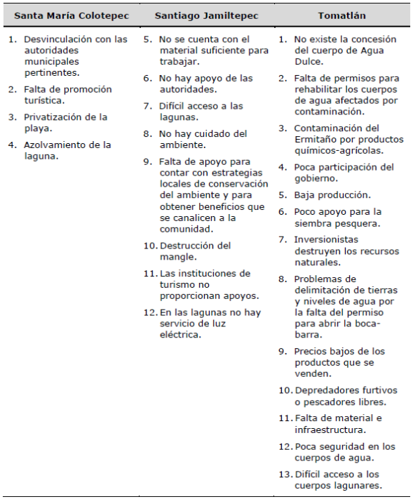 En cuanto a la priorización de los problemas, fue posible llegar a ello en los talleres de Santa María Colotepec, Santiago Jamiltepec y Tomatlán (Tabla 8), no así en el del municipio de Santa María Tonameca, pues en éste se consideró que no podía darse un consenso porque las autoridades necesitaban saber más de las aspiraciones y los conflictos que existen en torno al desarrollo de la actividad turística, por lo tanto plantearon la realización de otras sesiones de trabajo.