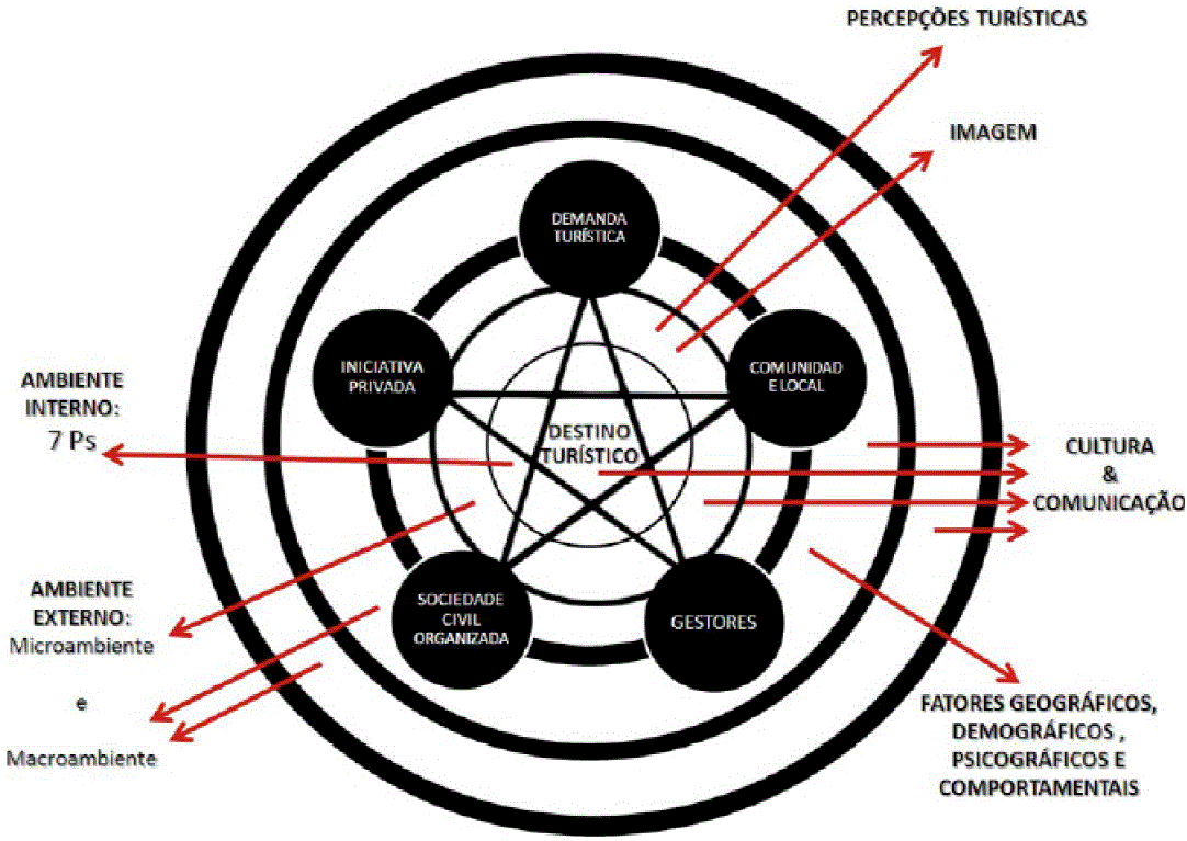 Explica-se, que este sistema funciona de fora para dentro e de dentro para fora, tal qual é a ação do homem sobre o meio, não se determina, são possibilidades. Assim, os círculos que envolvem em escalas o destino, funcionam como camadas de um sistema que, em maior ou menor grau, influenciam na percepção do mesmo. Desta forma, percebe-se que internamente o destino produz forças (7Ps) que, com o acréscimo das forças externas: microambiente: fornecedores, concorrentes, intermediários e demandas; e macroambiente: fatores político-legais, econômicos, socioculturais, tecnológicos e ambientais (Kotler, 2003), contribui-se com o olhar das demandas turísticas, e estas por sua vez, “respondem” com seus respectivos olhares sobre as soluções/benefícios, custos, conveniência, comunicação entre outros -base dos 4 Cs de Louterboun.